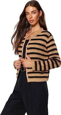 Women's Damen GESTREIFT Lange Ärmel Schlank Strickjacke Cardigan Sweater, Camel, S
