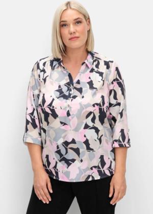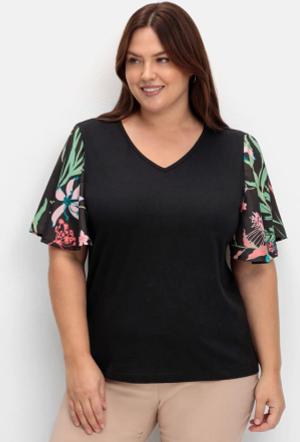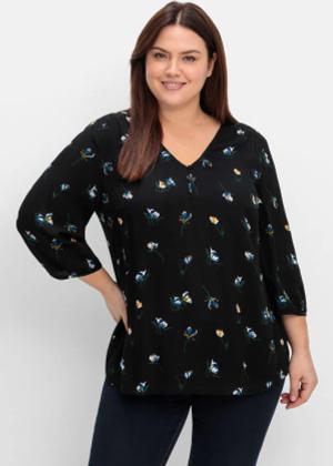 Große Größen: 3/4-Arm-Shirt mit Blumenprint und Herzausschnitt, schwarz gemustert, Gr.40/42-56/58