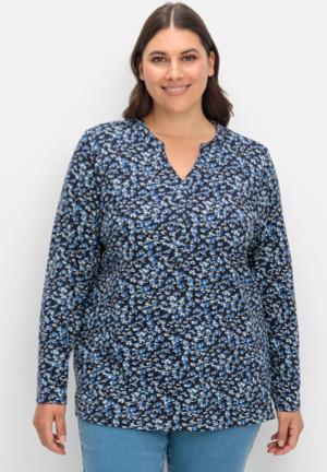 Große Größen: Langarmshirt mit V-Schlitz und floralem Minimalprint, tiefblau gemustert, Gr.40/42-56/58