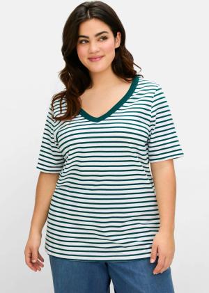 Große Größen: Ringelshirt mit V-Ausschnitt, in Rippstruktur, petrol gestreift, Gr.40/42-56/58