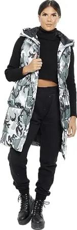 DAMEN STEPPWESTE CAMOUFLAGE LANG MIT KAPUZE WESTE ÄRMELLOS OUTDOOR STEPPMANTEL ÜBERGANGSJACKE HERBST WINTER GESTEPPT WARM JACKE BLOGGER FASHION NEU S-XL (L, Grau Camouflage)