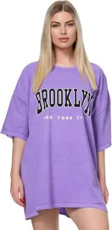 Oversized Print T-Shirt lang Tee Brooklyn Sommer Bedruckt Oberteil Loungewear Streetwear Blogger Neu (Baumwolle, Lila)