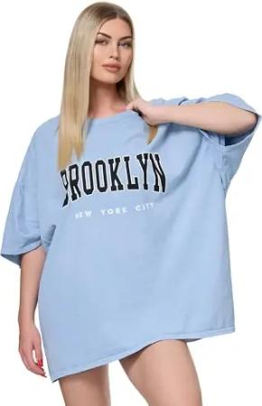 Oversized Print T-Shirt lang Tee Brooklyn Sommer Bedruckt Oberteil Loungewear Streetwear Blogger Neu (Baumwolle, Skyblau)