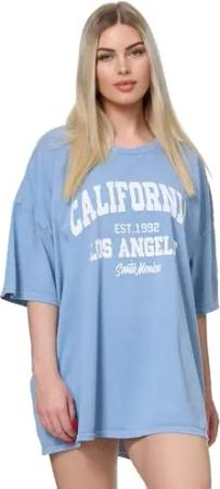 Oversized Print T-Shirt lang Tee California LA Sommer Bedruckt Oberteil Loungewear Streetwear Blogger Neu (Baumwolle, Skyblau)