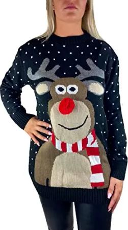 Weihnachten Merry Christmas Sweater Damen Pullover Teenager Mädchen Pulli Weihnachtspullover Xmas Rudolph Rentier Rote Bommel Nase (ML, Schwarz-1)