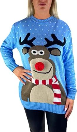 Weihnachten Merry Christmas Sweater Damen Pullover Teenager Mädchen Pulli Weihnachtspullover Xmas Rudolph Rentier Rote Bommel Nase (SM, Hellblau-1)