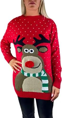 Weihnachten Merry Christmas Sweater Damen Pullover Teenager Mädchen Pulli Weihnachtspullover Xmas Rudolph Rentier Rote Bommel Nase (SM, Rot-1)