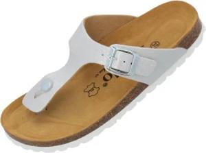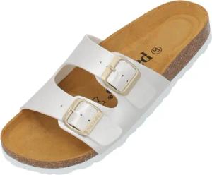 Pantoletten Damen Gozo - bequeme Sandalen Made in Spain - Hausschuhe mit dämpfendem Kork-Fußbett - modische Sommerschuhe Weiß Lack UK3,5 - EU36