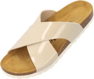 Pantoletten Damen Rianel - bequeme Sandalen mit gekreuzten Riemen - Hausschuhe - modische Sommerschuhe Beige Lack UK3,5 - EU36