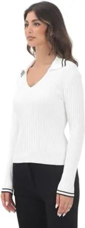 Weißer Pullover mit V-Ausschnitt für Damen mit schwarzen Streifen, Weiß, Medium