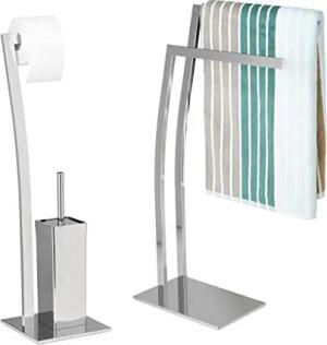 2 TLG Bad Set WIMEDO, Handtuchhalter freistehend, WC Garnitur ohne Bohren, Toilettenpapierhalter Silber, Toilettenbürste