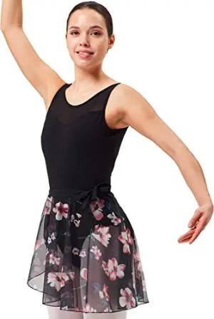 Ballett Wickelrock Damen - Karlotta - feiner, elastischer Netzstoff - Wickelband aus Lycra - schwarz geblümt 38 - schwarzer Ballettrock - Ballettkleidung für Erwachsene