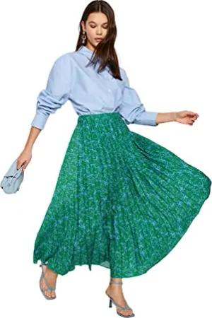 Damen Green Floral Pattern Pleated Woven with Elastic Waist Tctss23ee00018 Skirt, Green-Multicolor, 34 EU