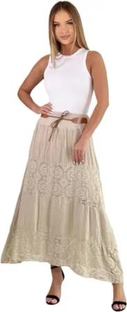 Langer Baumwollrock mit Spitze & Gürtel 3094 Beige