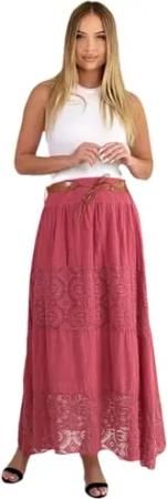 Langer Baumwollrock mit Spitze & Gürtel 3094 Himbeerrot hell