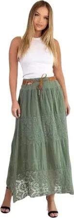 Langer Baumwollrock mit Spitze & Gürtel 3094 Olivgrün