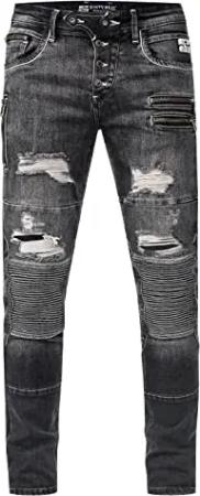 Herren Biker-Jeans 'Misato' DIE-Absolute-Jeans Slim Fit Stretch Destroyed Biker Zip-Design mit Stylischer Knopfleiste und Kontrast-Naht 241, Farbe:Vintage Used, Größe Jeans L32:36W / 32L
