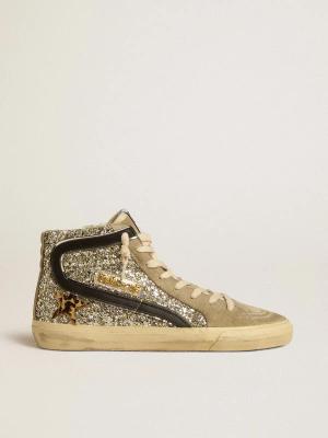 Slide Aus Platinfarbenem Glitzer Mit Leo-stern Aus Cavallino-leder Und Schwarzem Komma, Frau, Größe: 35