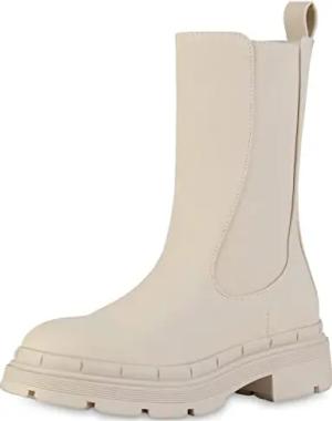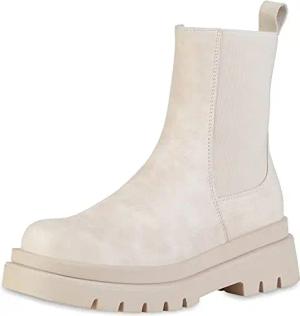 Damen Stiefeletten Chelsea Boots Blockabsatz Schuhe Profilsohle Schlupfschuhe Freizeit Plateau Vorne Booties 208150 Creme 36
