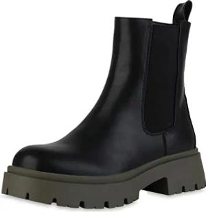Damen Plateau Boots Stiefeletten Profilsohle Schuhe Blockabsatz Plateauschuhe Freizeit Booties 211965 Schwarz Olivgrün 37