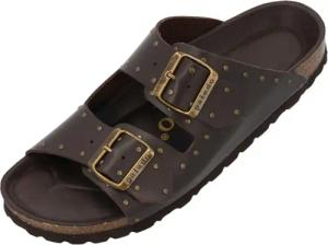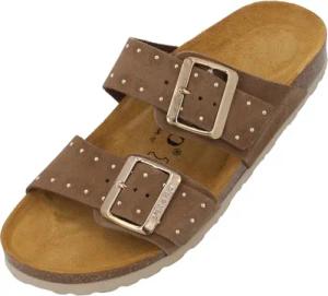 Pantoletten Damen Elaha Rivet - elegante Sandalen Made in Spain - bequeme Hausschuhe mit Kork-Fußbett - modische Sommerschuhe mit Nietendetails Dunkelbraun UK6 - EU39
