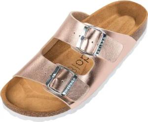 Pantoletten Damen Chios - bequeme Sandalen Made in Spain - Hausschuhe mit dämpfendem Kork-Fußbett - modische Sommerschuhe Metallic Rosegold UK9 - EU42