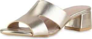 Damen Pantoletten Blockabsatz Cut-Outs Trendy Schuhe 216714 Gold 37