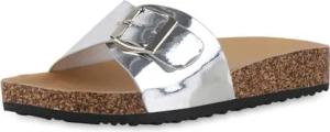 Damen Pantoletten Flach Korkoptik Bequem Schuhe 217140 Silber 36
