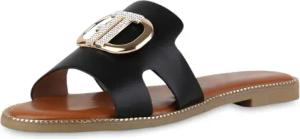 Damen Pantoletten Flach Schnallen Trendy Schuhe 214831 Schwarz Nieten 36