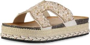 Damen Pantoletten Plateau Strass Trendy Schuhe 214460 Beige Zierperlen 39