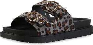 Damen Pantoletten Flach Basic Trendy Schuhe 217421 Grau Leopard 37