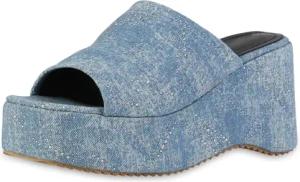Damen Pantoletten Plateau Strass Trendy Schuhe 214462 Hellblau Zierperlen 36
