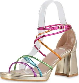Damen Riemchensandaletten Blockabsatz Plateau Vorne Trendy Schuhe 216823 Mehrfarbig Metallic 36