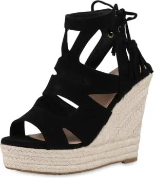 Damen Keilsandaletten Keilabsatz Bast Trendy Schuhe 215188 Schwarz Velours 37