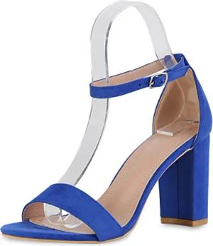 Damen Klassische Sandaletten Blockabsatz Schuhe Basic Freizeitsandaletten Veloursleder-Optik Absatzschuhe 210804 Blau Silber 36