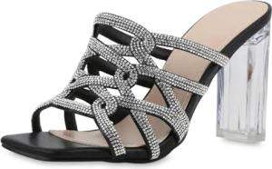 Damen Pantoletten Blockabsatz Strass Party Schuhe 217085 Schwarz 38