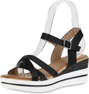Damen Plateau Sandaletten Keilabsatz Glitzer Trendy Schuhe 214483 Schwarz 41