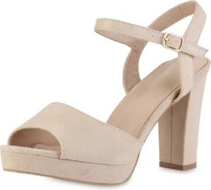 Damen Riemchensandaletten Sandaletten Blockabsatz Plateau Vorne Leder-Optik Absatz-Schuhe 840399 212599 Beige 40