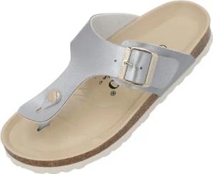 Kos BEGS by Sila Sahin Damen Pantoletten - modische Sandalen mit Natur Kork-Fussbett - bequeme Sandalen mit extra großer Schnalle Grau Metallic UK9 - EU42