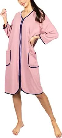 Damen Bademantel Morgenmantel mit Reißverschluss Hausmantel Leicht 3/4 Ärmel, Farbe: Puderrosa, Größe: 5XL