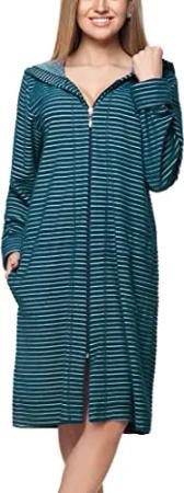 Damen Bademantel Morgenmantel mit Reißverschluss Streifen Kurz Baumwolle, Farbe: Streifenmuster Smaragdgrün, Größe: S
