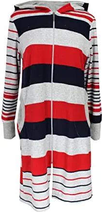 Damen Frottee Bademantel Morgenmantel Gestreift mit Kapuze, Farbe: Dunkelblau/Rot, Größe: S