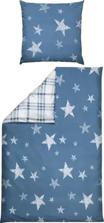 Wendebettwäsche Feinbiber Sterne und Karos blau Größe 80x80 cm / 155x240 cm - für kalte Nächte, samtig weich, wohlig warm, temperaturausgleichend, pflegeleicht, mit Reißverschluss