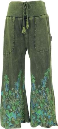 GURU SHOP Palazzohose, Boho Baumwollhose, Hippiehose mit Blüten, Schlaghose - Grün, Damen, Size:M