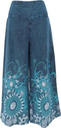 GURU SHOP Palazzohose, Boho Flower Power Baumwollhose, Hosenrock mit Blüten, Schlaghose - Blau, Damen, Size:L/XL