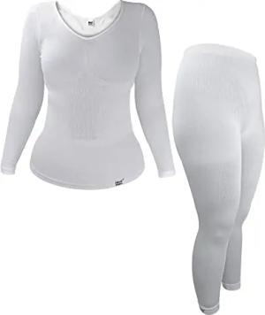 Damen Thermounterwäsche Thermoshirt Langarm für Winter | Extra Warm Innenfleece Lang Johns (L-XL, Weiss)