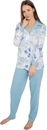 Damen Langarm Pyjama Schlafanzug Baumwolle Knopfleiste DF469 Gr: 46