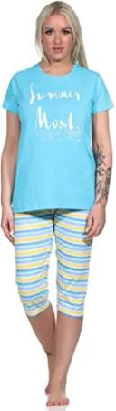 Sommerlicher Damen Capri Schlafanzug, Kurzarm Pyjama - Hose Geringelt - 12220410752, Farbe:hellblau, Größe:48-50