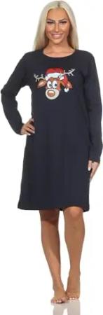 Damen Langarm Weihnachts Nachthemd mit lustigen Renntier Motiv, Farbe:Navy, Größe:36-38