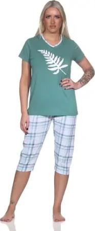 Damen Schlafanzug Kurzarm Pyjama mit Capri-Pyjamahose in Streifenoptik, Farbe:grün, Größe:44-46